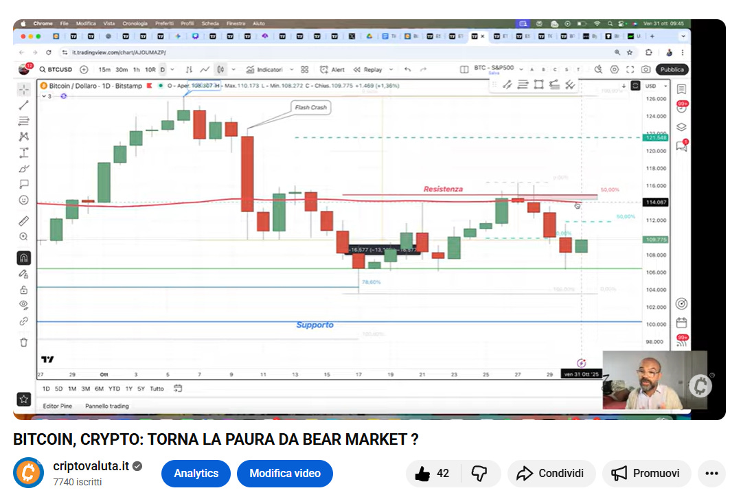 Siamo al 3 novembre 2025. Come ci fa osservare il nostro analista tecnico Alessandro Lavarello sia sulla testata giornalistica criptovaluta.it che all’interno dei suoi spazi sul canale Youtube del canale, BTC al momento si trova a combattere in una forbice di prezzo compresa tra un primo supporto sul breve intorno ad area 106.400$ e una seconda resistenza a 114.000$/115.000$, considerando un’area supportiva stabile intorno 100.500.