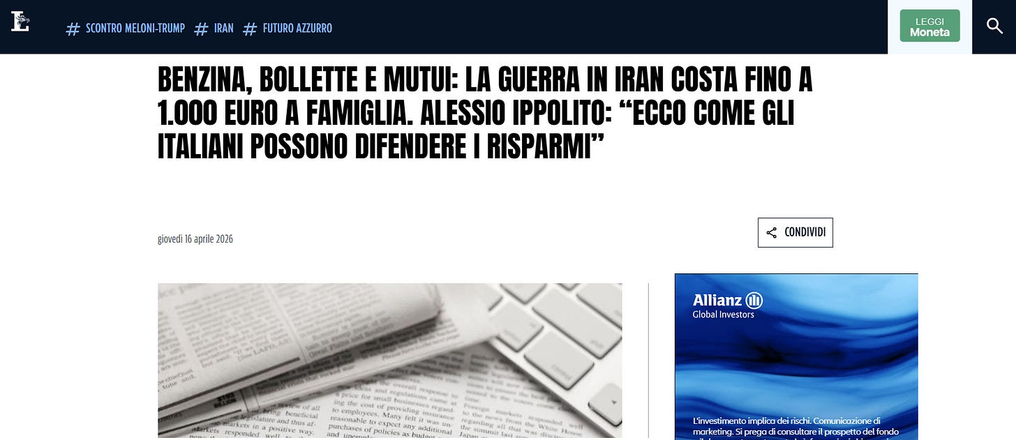 Partiamo dal fatto più recente. Il 16 aprile, a poche ore dalla svolta diplomatica, Libero Quotidiano mi ha chiesto di fornire un’analisi sull’impatto concreto della crisi iraniana sulle famiglie italiane: fino a 1.000 euro all’anno di rincari tra benzina, bollette, mutui e carrello della spesa. Il tema centrale non era però il conto dei danni — quello lo vedono tutti — ma come proteggere il patrimonio in un contesto dove l’inflazione al 2% e i conti correnti che rendono lo 0,1% producono una perdita reale di potere d’acquisto vicina al 2% annuo. In cinque anni, sono circa il 10% erosi silenziosamente.