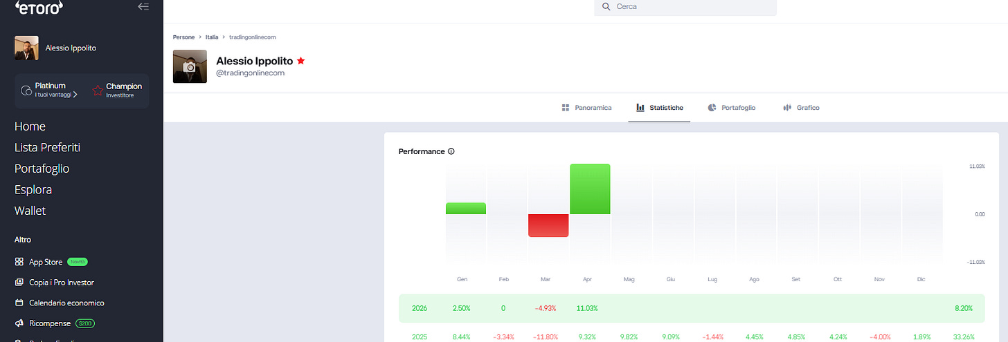 E adesso arriviamo al punto che mi sta più a cuore. Perché i riconoscimenti delle testate sono importanti — e ringrazio sia Libero Quotidiano che Il Tempo per la fiducia accordata — ma il metro di giudizio vero, per un Popular Investor PRO Champion su eToro, sono i numeri del portafoglio pubblico. Quello che ogni utente della piattaforma, copiator o semplice curioso, può verificare in ogni momento sul mio profilo @tradingonlinecom.