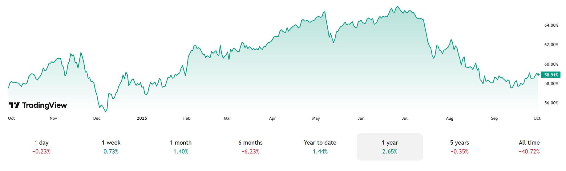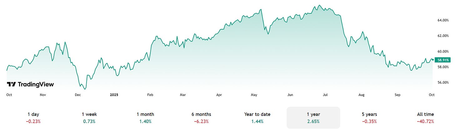 Ott 2024 57.3% → 59% Sottoperformance BITCOIN ✓