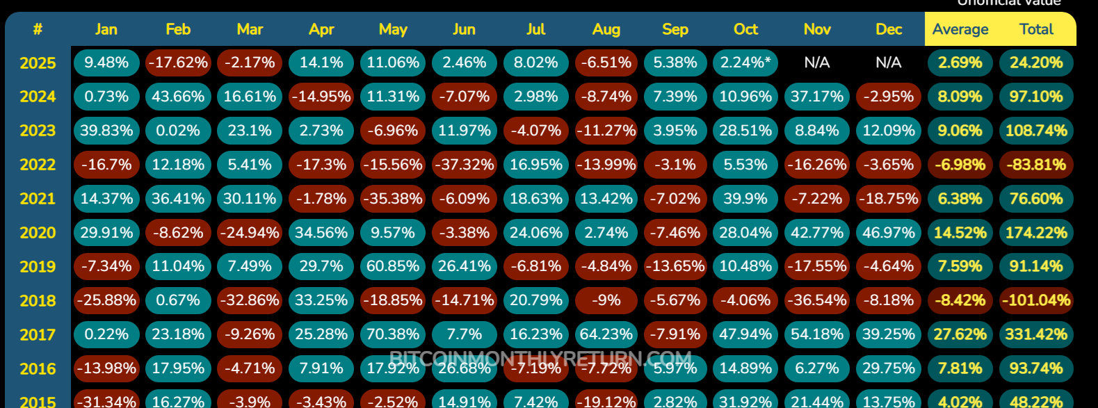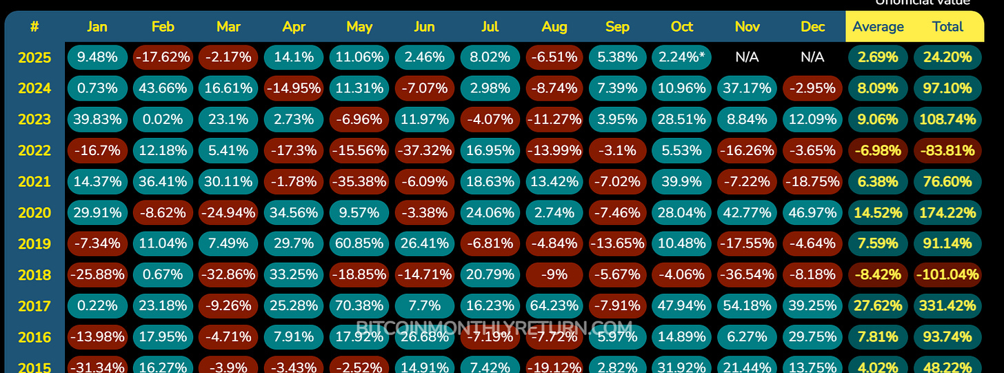 Anche se nessuno lo dice… ecco un dato che pochi ti diranno: novembre è storicamente più forte di ottobre, con una media del +36.16% contro il +25.91% di ottobre. Se proprio vuoi giocare la stagionalità, novembre è statisticamente la scelta migliore. Ma questo distrugge il meme di “Uptober”, quindi lo ignorano tutti.